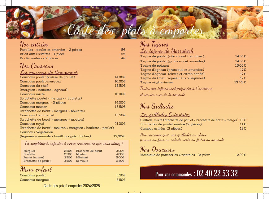 Welcome to De Hammamet à Marrakech, a delightful Moroccan restaurant nestled in Saint-Nazaire, France. This culinary gem invites you to embark on a vibrant journey through Moroccan flavors. The menu boasts an array of dishes that showcase the rich heritage of Moroccan cuisine, artfully prepared to tantalize your taste buds.